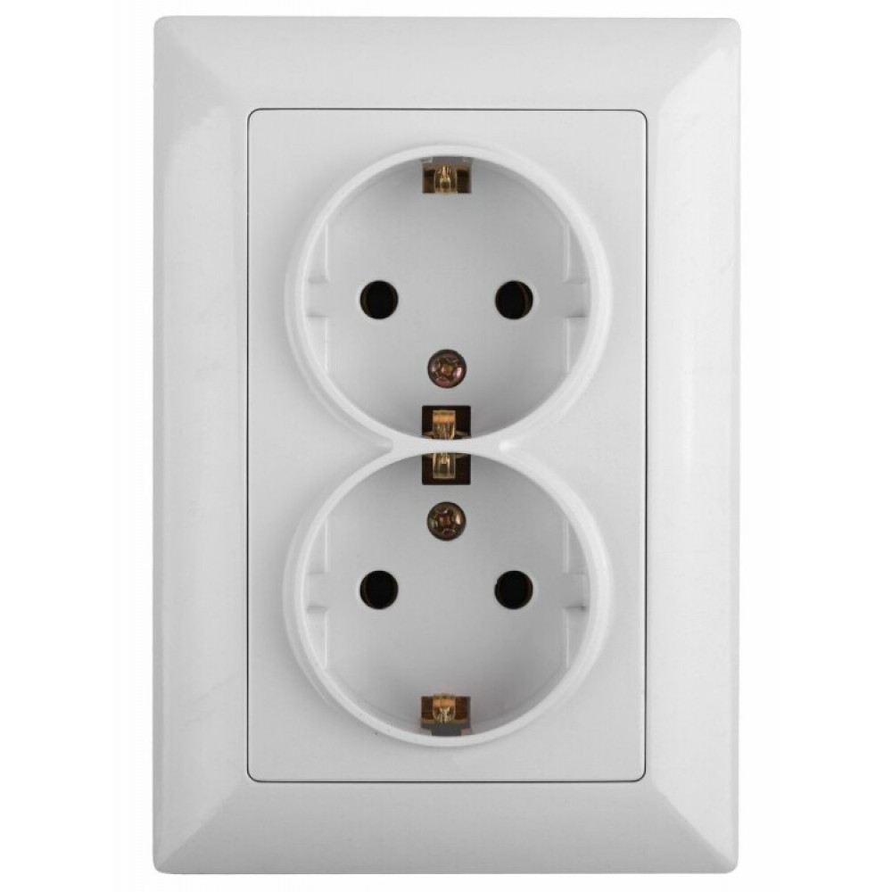 Описание Розетка Solo 4-208-01 с заземлением двойная 2X2P+E Schuko со шторками, 16А-250В, IP20, СУ, белый Б0053697