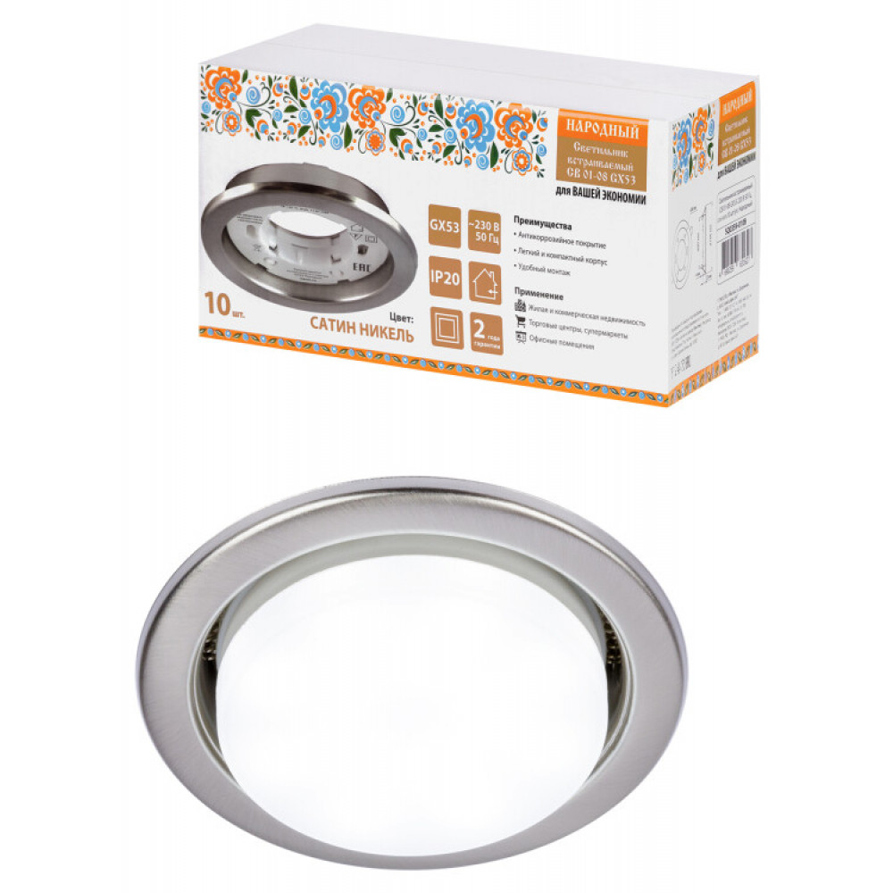 Описание Светильник встраиваемый СВ 01-08 GX53 220 В 50 Гц, сатин никель, 10 шт/уп, Народный SQ0359-0108