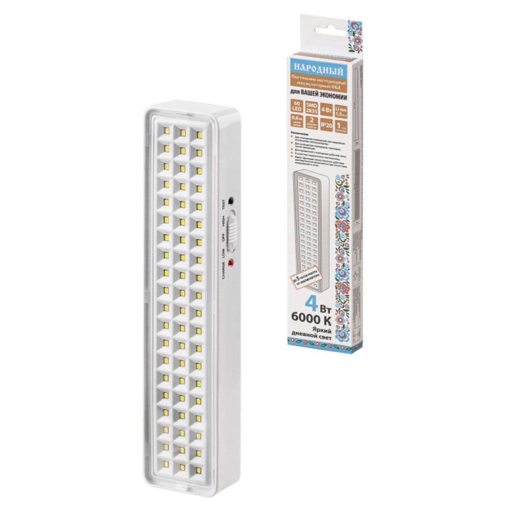 Светильник светодиодный аккумуляторный СБА 60 LED, DC, Li-ion 3,7 В 1,5 А*ч, 3-5 ч,пластик, Народный SQ0308-0301