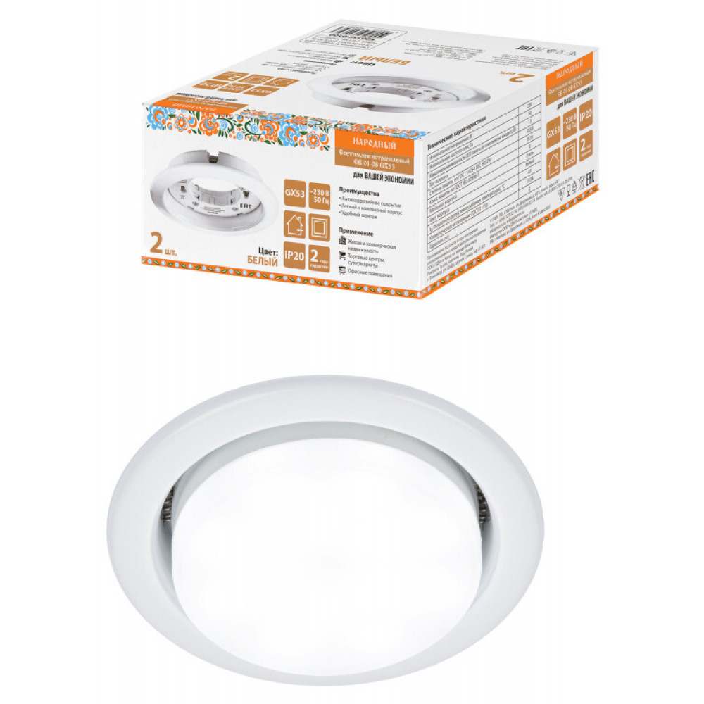 Описание Светильник встраиваемый СВ 01-08 GX53 220 В 50 Гц, белый, 2 шт/уп, Народный SQ0359-0100