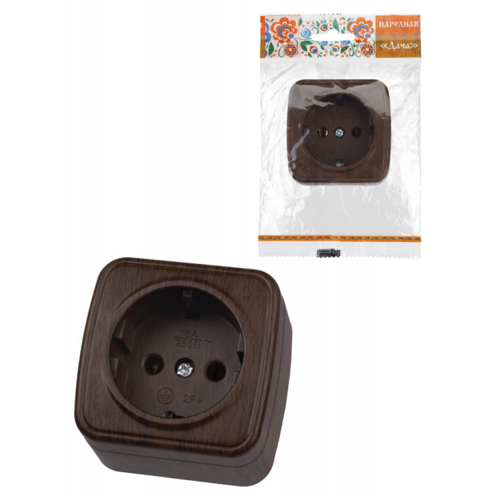 Описание Розетка 2П+З открытой установки IP20 16А, венге "Дача" Народная SQ1824-0028