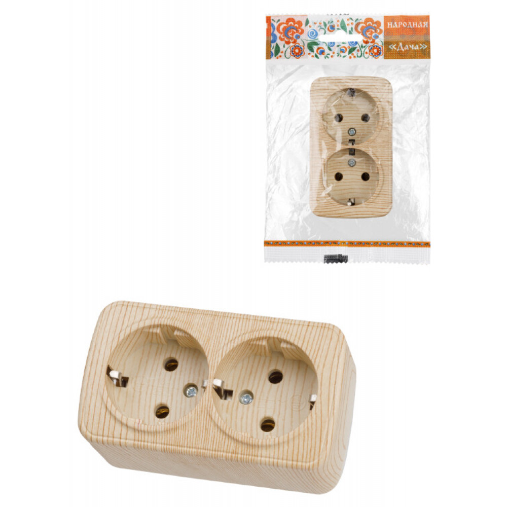 Описание Розетка двойная 2П+3 открытой установки IP20 16А, сосна "Дача" Народная SQ1824-0040