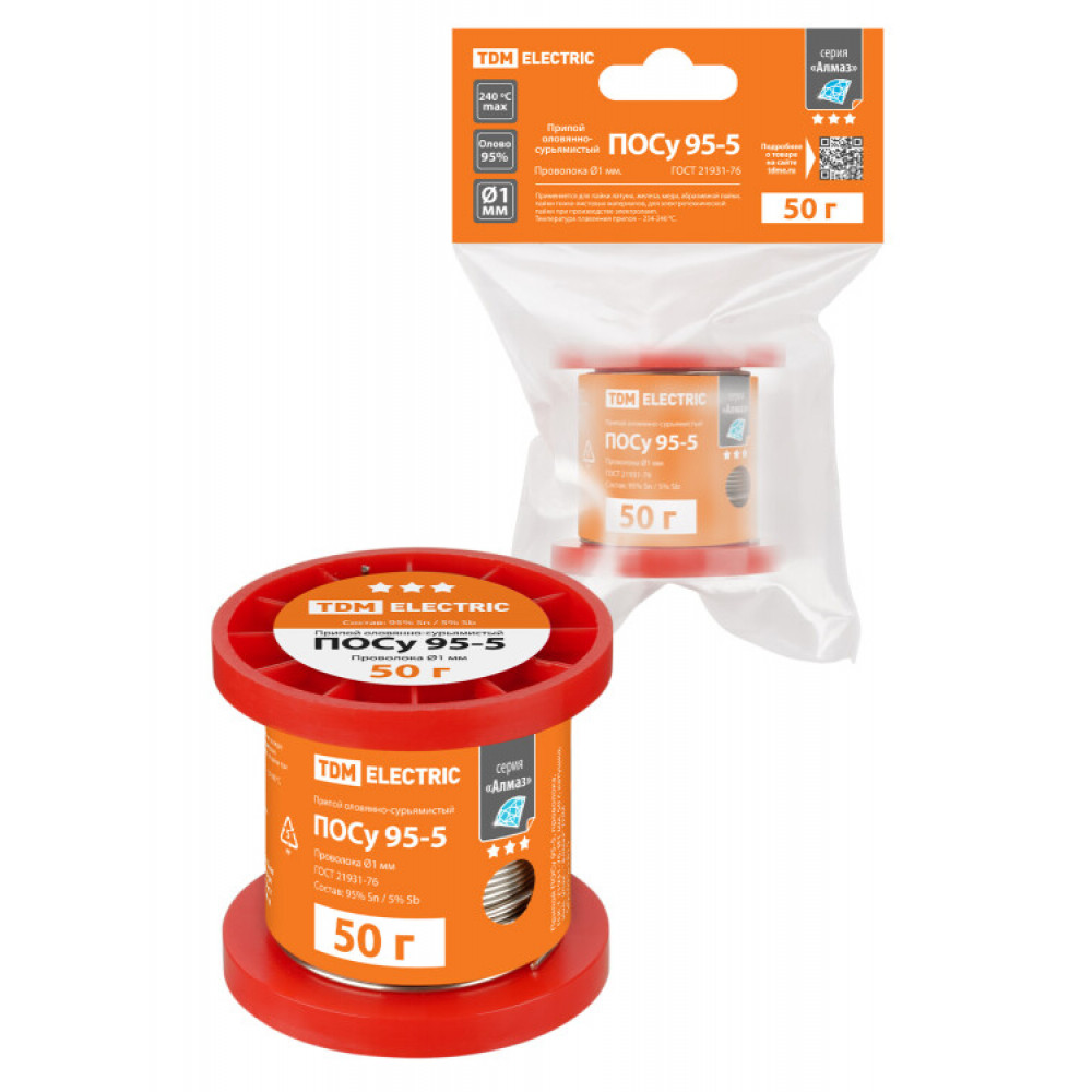 Припой ПОСу 95-5, проволока, ГОСТ 21931-76, 1 мм, 50 г, катушка, инд. упак., "Алмаз" SQ1025-1815, Припой без флюса
