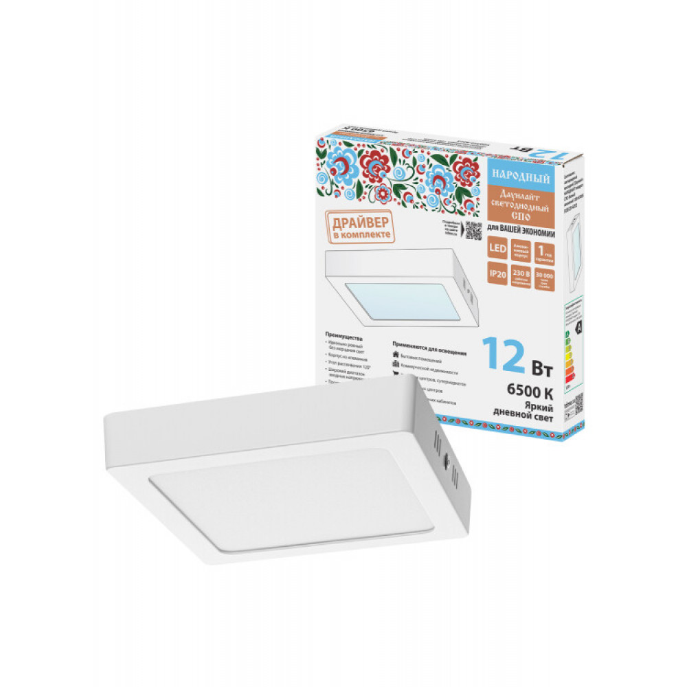 Описание Светильник светодиодный накладной "Даунлайт НАРОДНЫЙ" квадрат СПО (белый) алюминий 12Вт 6500К SQ0329-4205