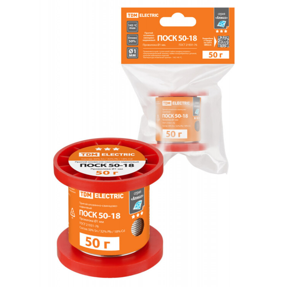 Описание Припой ПОСК 50-18, проволока, ГОСТ 21931-76, 1 мм, 50 г, катушка, инд. упак., "Алмаз" SQ1025-1817