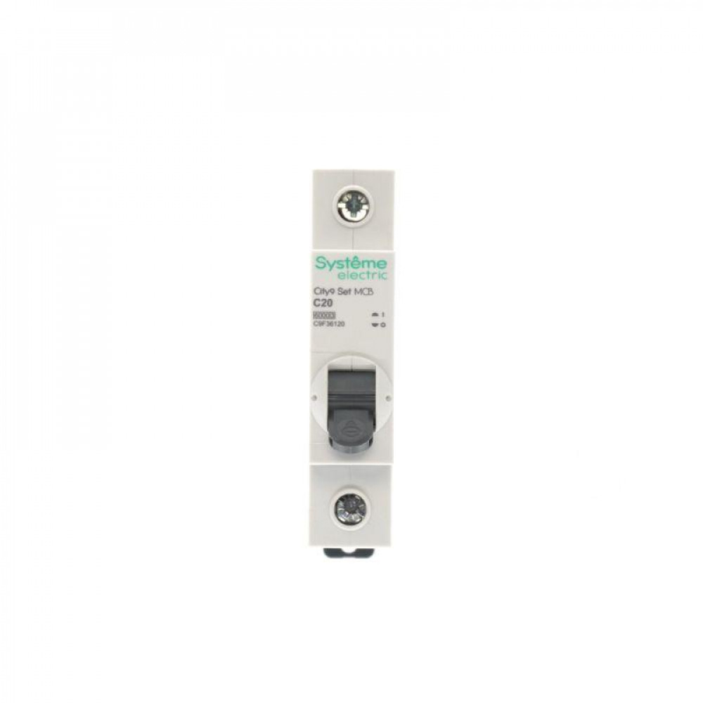 Автоматический выключатель серии City9 Set Systeme Electric, 1-полюсный, номинальный ток 20 А, характеристика С, Icn - 6 кА. Применяется в электрических сетях напряжением 230 В. Предназначен для защиты от перегрузок и токов короткого замыкания. Оснащен механизмом «мгновенной коммутации». Ударопрочный корпус из специального пластика с 6 металлическими заклепками. Безопасные клеммы исключают попадание кабелей в заклеммное пространство.