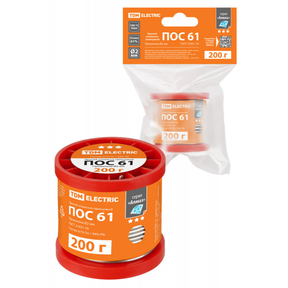 Описание Припой ПОС 61, проволока, ГОСТ 21931-76, 2 мм, 200 г, катушка, инд. упак., "Алмаз" SQ1025-1808