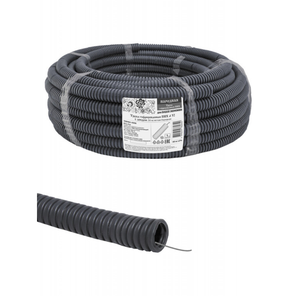 Труба гофрированная ПВХ d 32 с зондом (50 м) легкая Народная SQ0401-0306, Труба и короб для прокладки кабеля