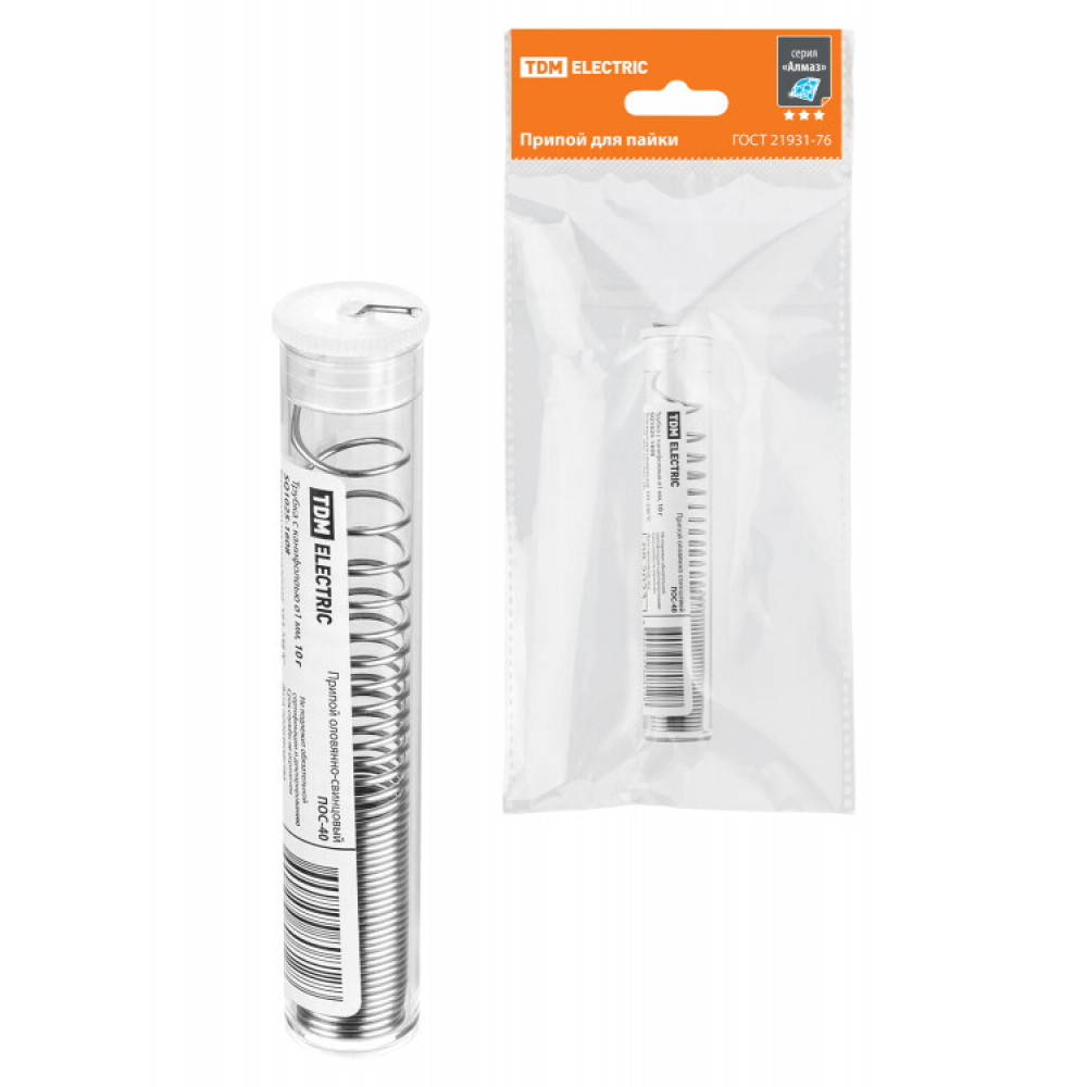 Описание Припой ПОС 40, трубка с канифолью, ГОСТ 21931-76, 1 мм, 10 г, колба, серия "Алмаз" SQ1025-1608