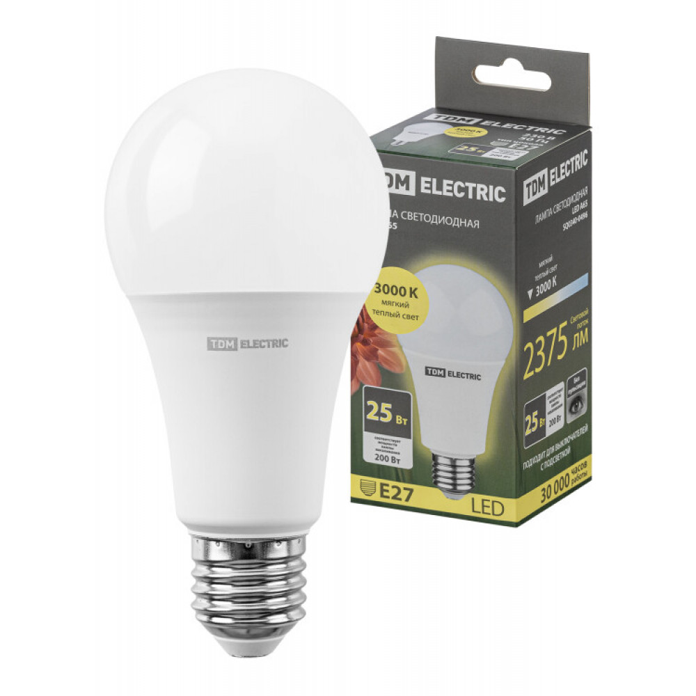 Лампа светодиодная А65 25 Вт, 230 В, 3000 К, E27 SQ0340-0496, Лампа светодиодная