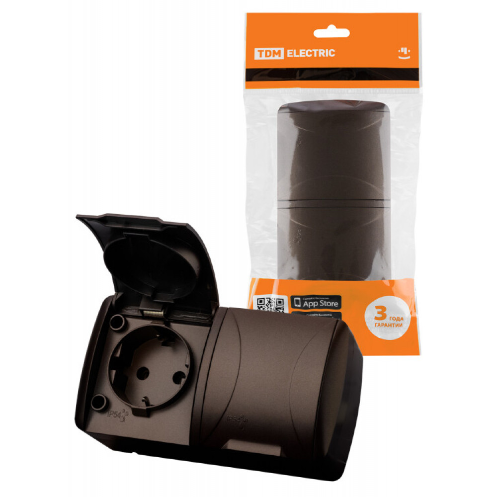 Описание Розетка двойная 2П+3 открытой установки IP54 16А с крышкой шоколад "Селигер" SQ1818-0214
