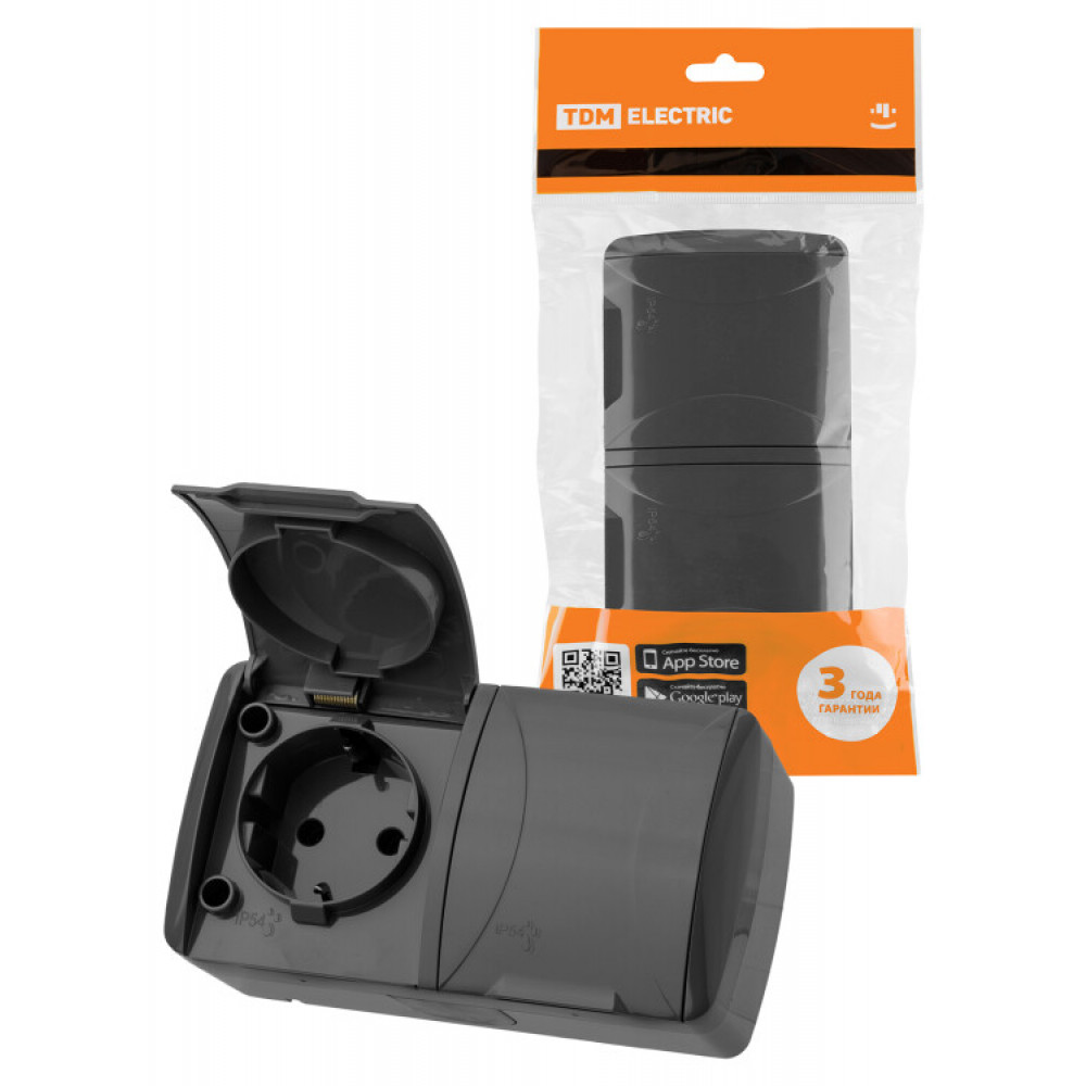 Описание Розетка двойная 2П+3 открытой установки IP54 16А с крышкой серая "Селигер" SQ1818-0114