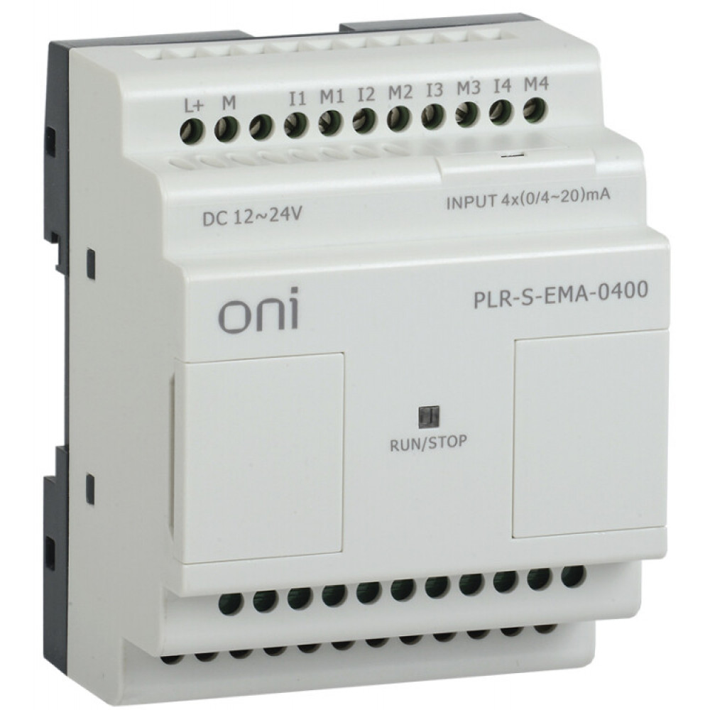 Модуль расширения 4 каналами аналогового входа (0/4..20мА). Предназначен для увеличения используемых каналов аналогового ввода программируемого логического реле ONI PLR-S. Напряжение питания 12-24 В DC.