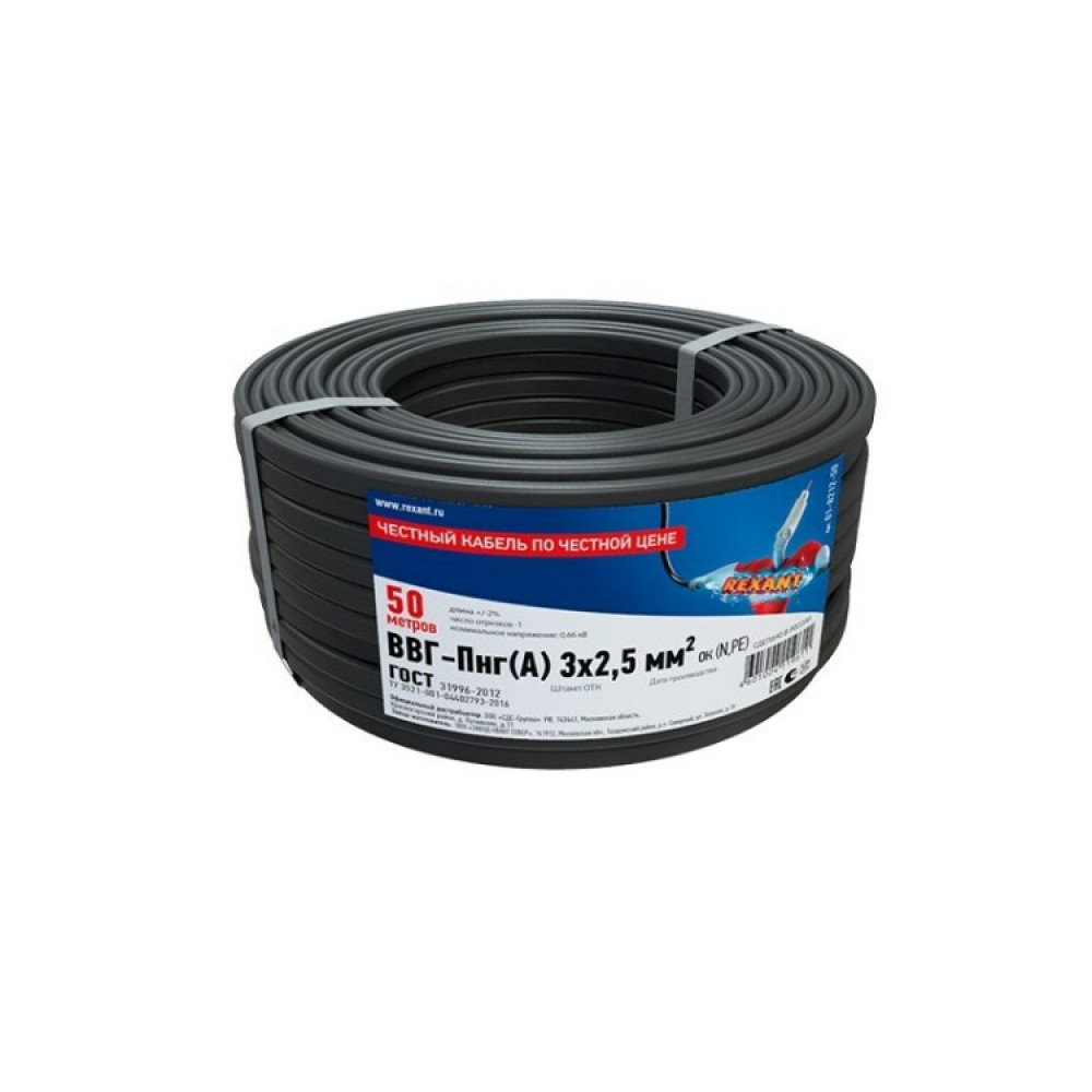 Кабель силовой медный ВВГ-Пнг(А) 3x2,5 мм, 50 метров, ГОСТ 31996-2012, ТУ 1 01-8212-50, Кабель и провод силовой для стационарной прокладки
