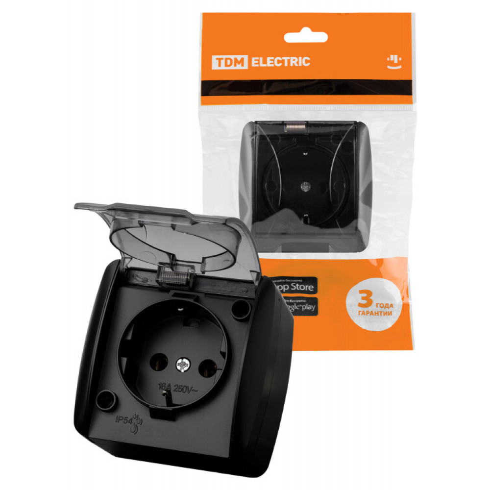 Описание Розетка 2П+3 открытой установки IP54 16А с прозрачной крышкой графит "Селигер" SQ1818-0307