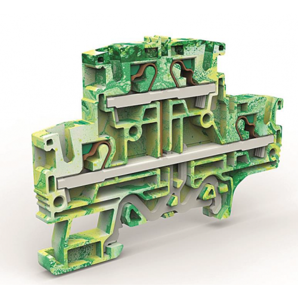 Заземляющая этажная клемма, 2 этажа, тип фиксации провода: Push-in, номинальное сечение: 4 мм кв., ширина: 6,2 мм, цвет: желто-зеленый, тип монтажа: DIN35,