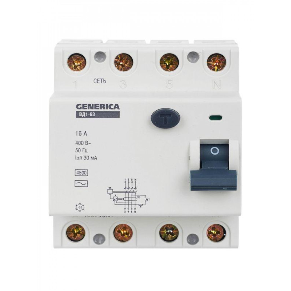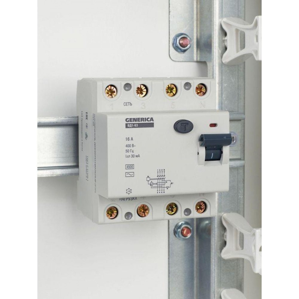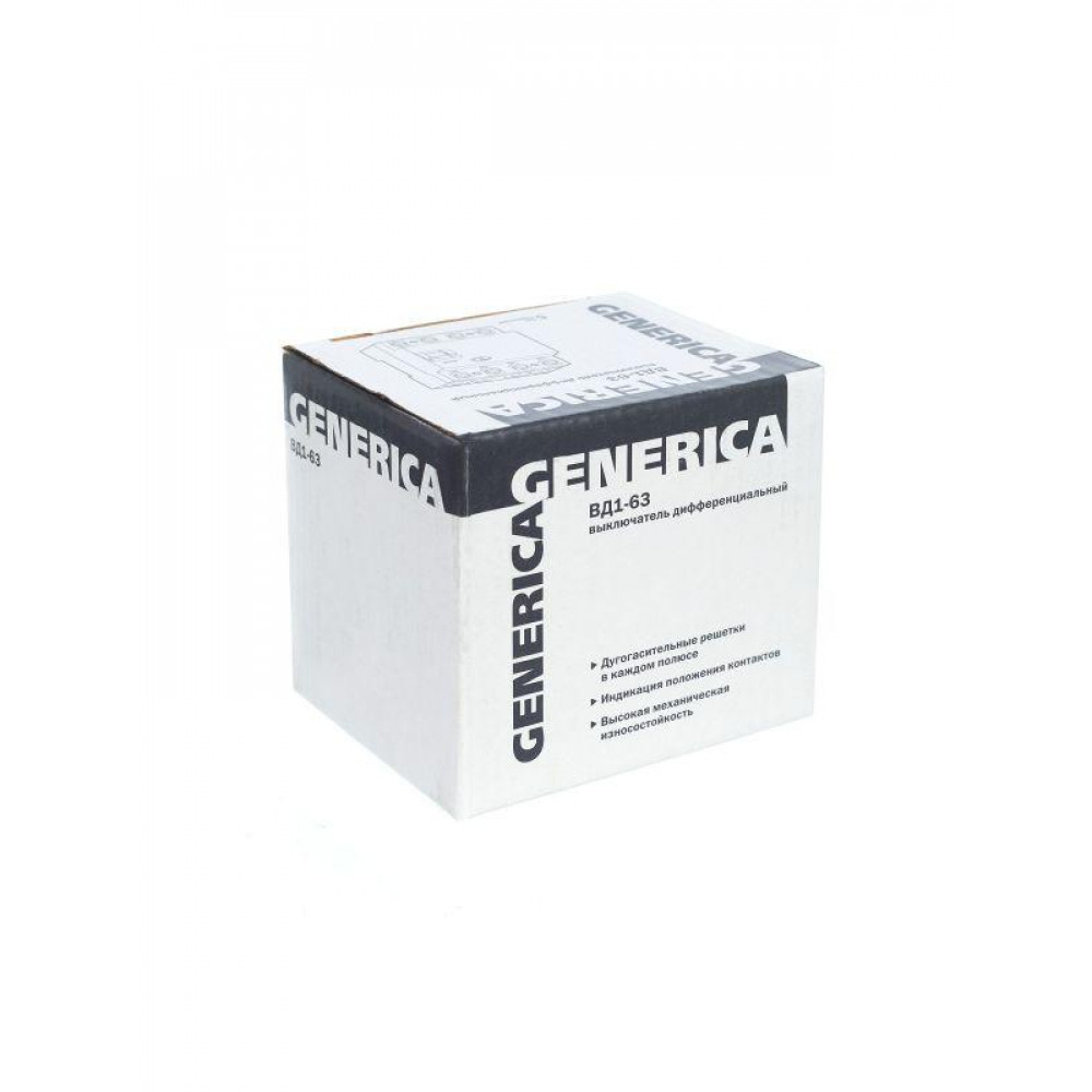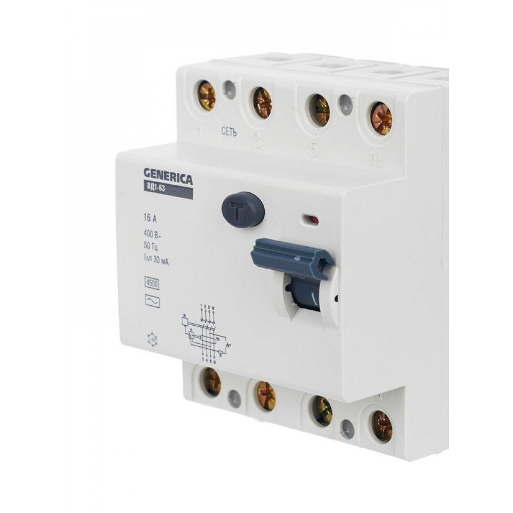 Быстродействующий защитный выключатель ВД1-63 (УЗО) GENERICA - устройство электронного типа, зависящее от напряжения и реагирующее на дифференциальный ток, без встроенной защиты от сверхтоков. Предназначен для защиты человека от поражения электрическим током.
