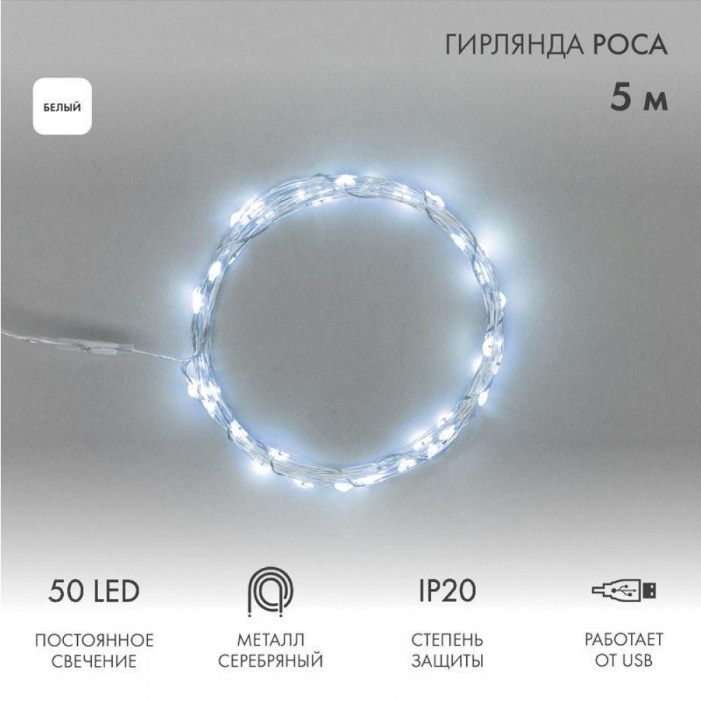 Гирлянда Роса 5 м, 50 LED, USB, белое свечение 315-965, Светильник декоративный