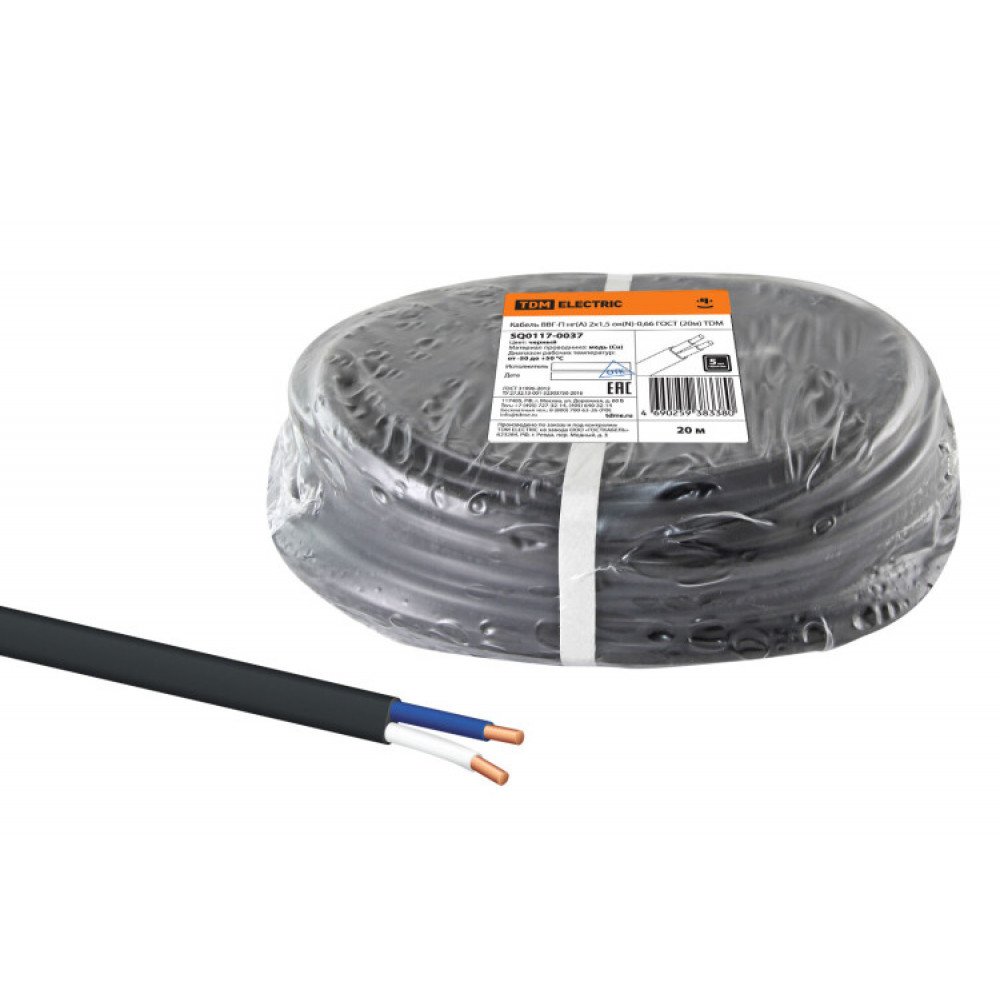 Кабель ВВГ-П нг(А) 2х1,5 ок(N)-0,66 ГОСТ (20м) SQ0117-0037, Кабель и провод силовой для стационарной прокладки