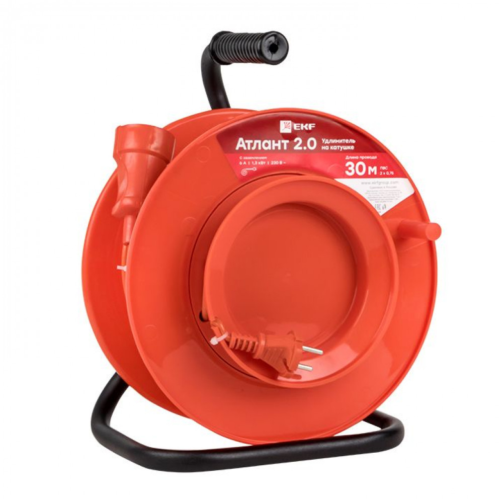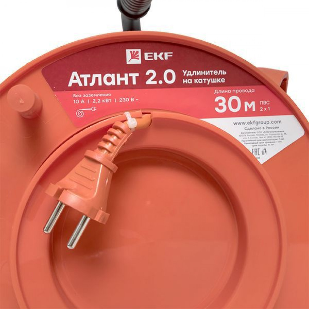 Удлинитель на катушке "Атлант 2.0" 1 гнездо 30м без заземления ПВС 2*1 10А/2,2кВт PROxima UKA02-10-210-1-30, Удлинитель, сетевой фильтр