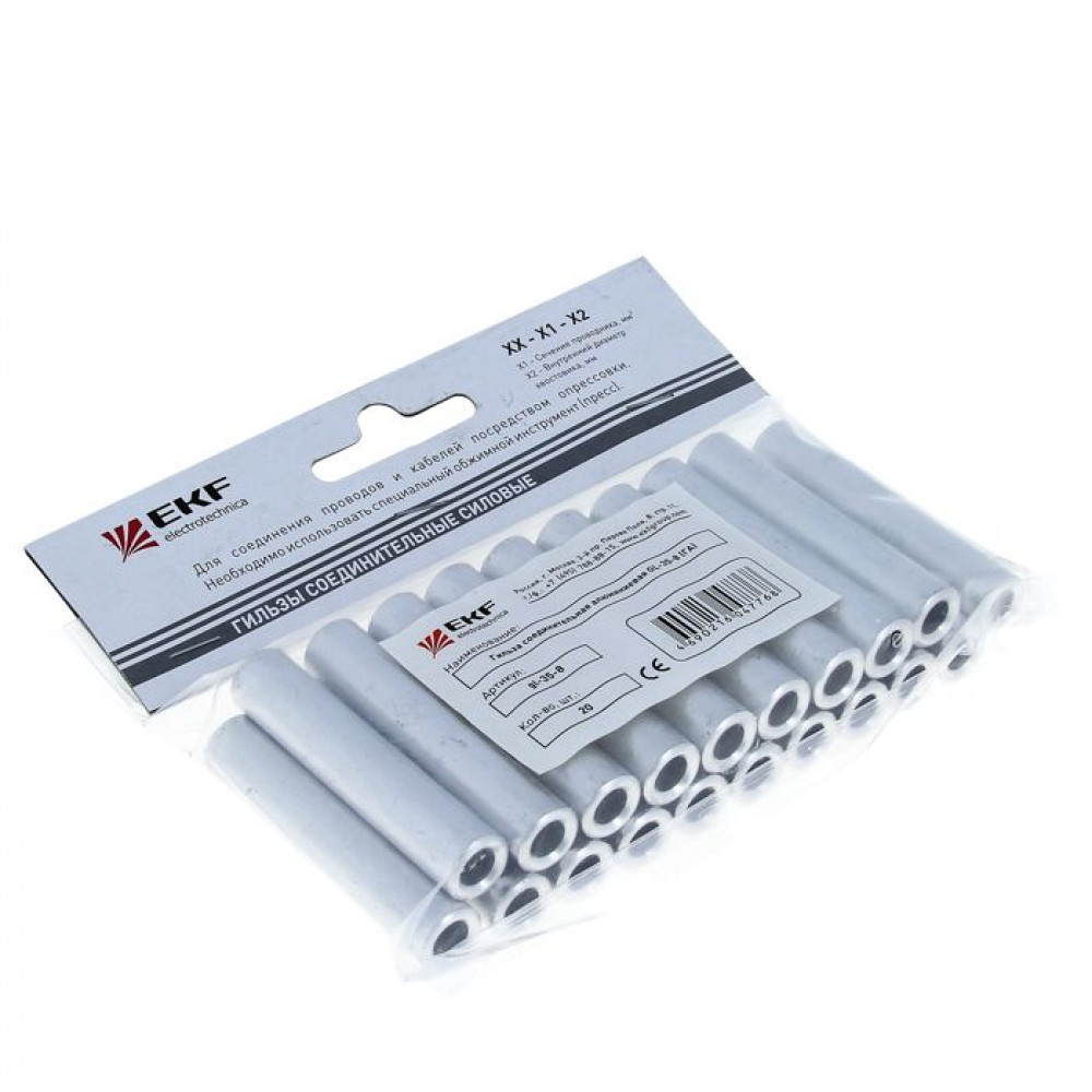 Гильзы алюминиевые EKF PROxima изготавливаются из цельнотянутой алюминиевой трубы марки АД1 и имеют сквозную конструкцию. При соединении посредством гильз секторные жилы перед опрессовкой должны быть предварительно скруглены.