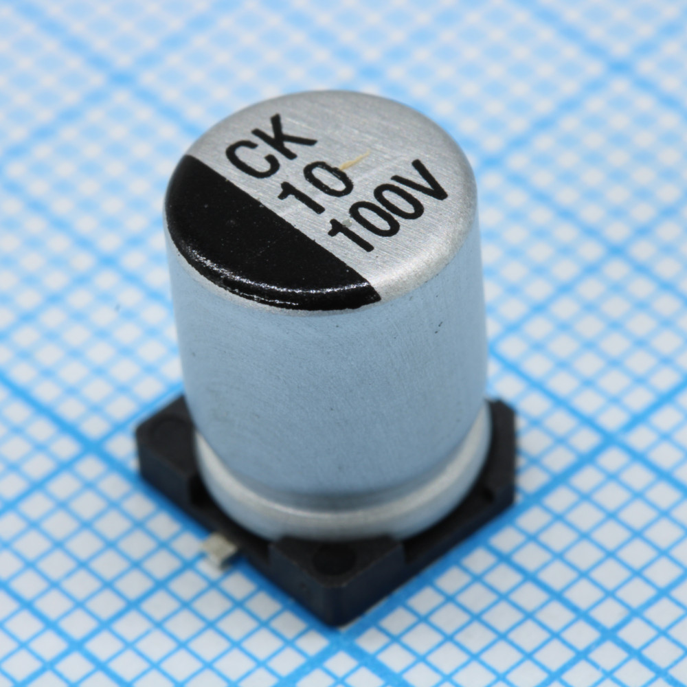 Доставка JCK2A100M080105 , Конденсатор алюминиевый электролитический SMD 10мкФ 100В ±20% (8х10.5)мм 77мА 2000час 105°C лента на катушке