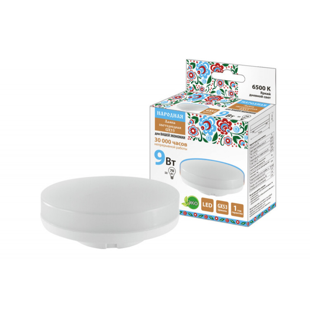 Лампа светодиодная GX53-9 Вт-230 В-6500 К-Э, h=26 мм, Народная SQ0340-1555, Лампа светодиодная