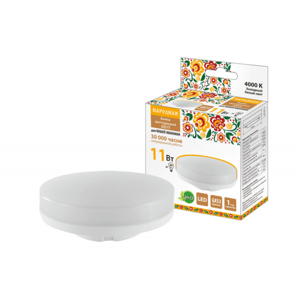 Описание Лампа светодиодная GX53-11 Вт-230 В-4000 К-Э, h=26 мм, Народная SQ0340-1551