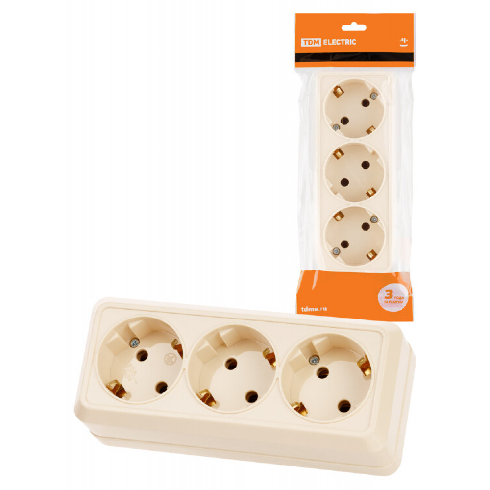Розетка 3-х местная горизонтальная 2П+3 открытой установки IP20 16A сл. кость "Ладога" SQ1801-0226, Розетка открытого монтажа
