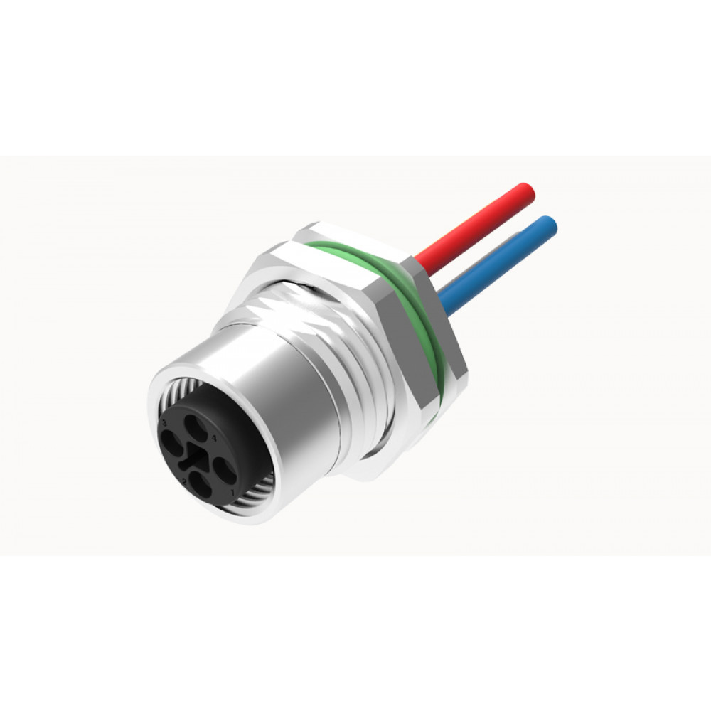 Розеточный разъем в панель, 4 полюса, M12, гайка спереди, с проводом, Т-Code, сечение проводовников: 0.34 мм кв., (цвет проводовников: коричневый, белый, синий, черный), 4А, 250V, PG9, металл