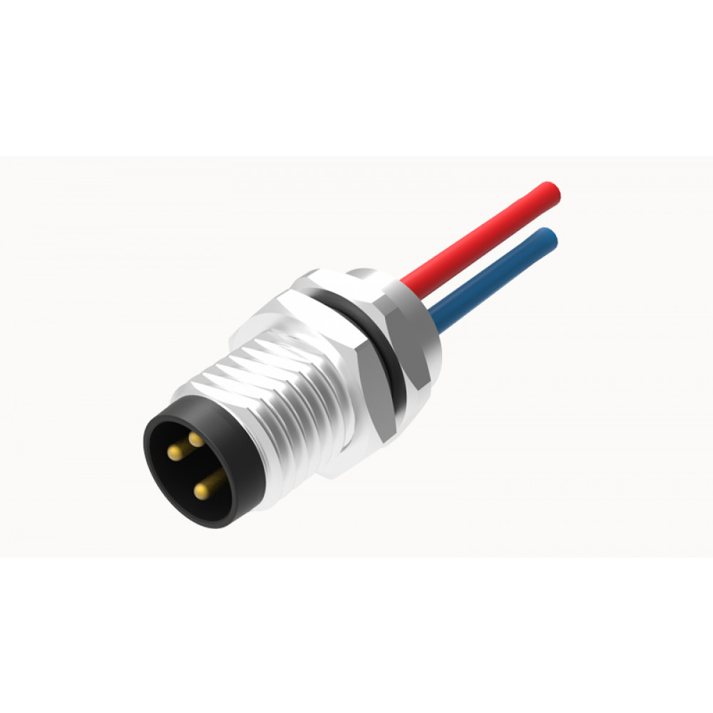 Вилочный разъем в панель, 6 полюсов, M8, гайка спереди, с проводом 0,5 метра, A-Code, 1,5А, 30V, резьба на гайке M8*1.0, резьбовое соединение: латунь неэкранированный