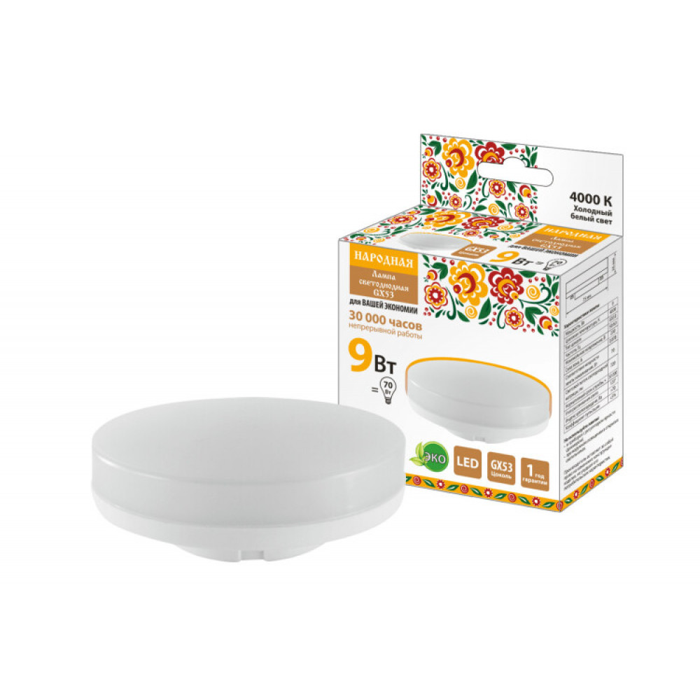 Лампа светодиодная GX53-9 Вт-230 В-4000 К-Э, h=26 мм, Народная SQ0340-1522, Лампа светодиодная