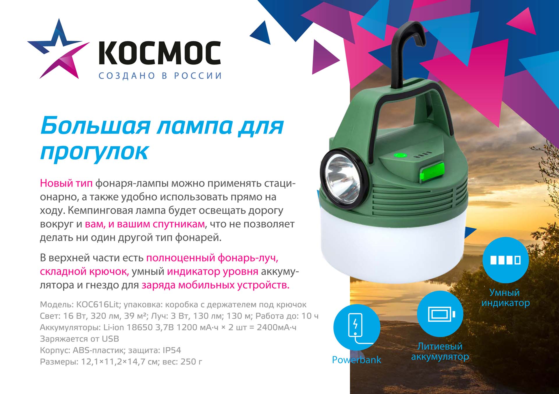 Описание Фонарь аккумуляторный кемпинговый походный 16Вт SMD LED+3Вт LED Li-ion 18650 2400мА.ч Power-bank корпус ABS-пластик индикатор уровня заряда USB-шнур складной крючок для подвешивания матов. рассеив. KOC616Lit