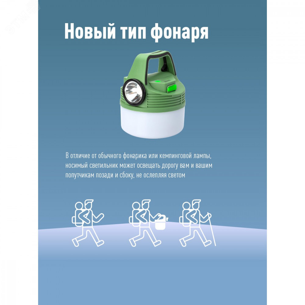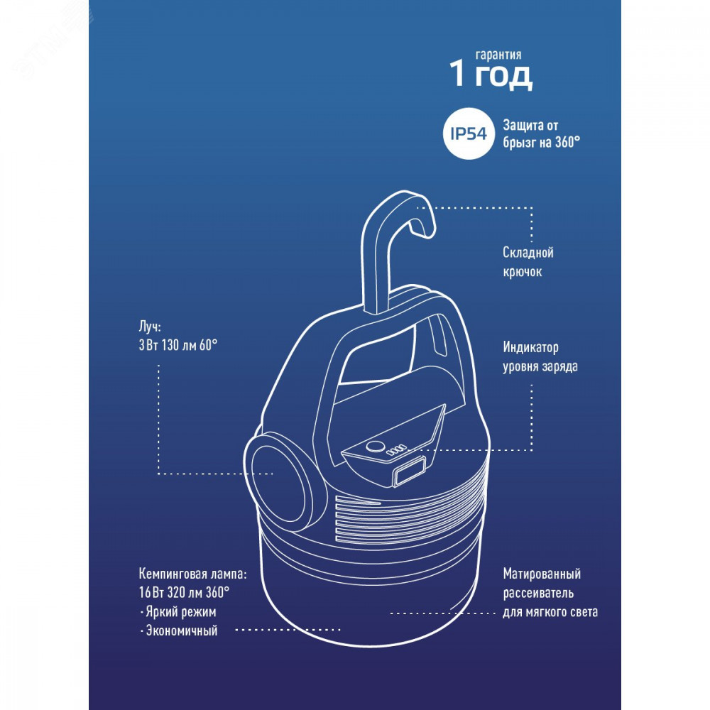 Доставка Фонарь аккумуляторный кемпинговый походный 16Вт SMD LED+3Вт LED Li-ion 18650 2400мА.ч Power-bank корпус ABS-пластик индикатор уровня заряда USB-шнур складной крючок для подвешивания матов. рассеив. KOC616Lit