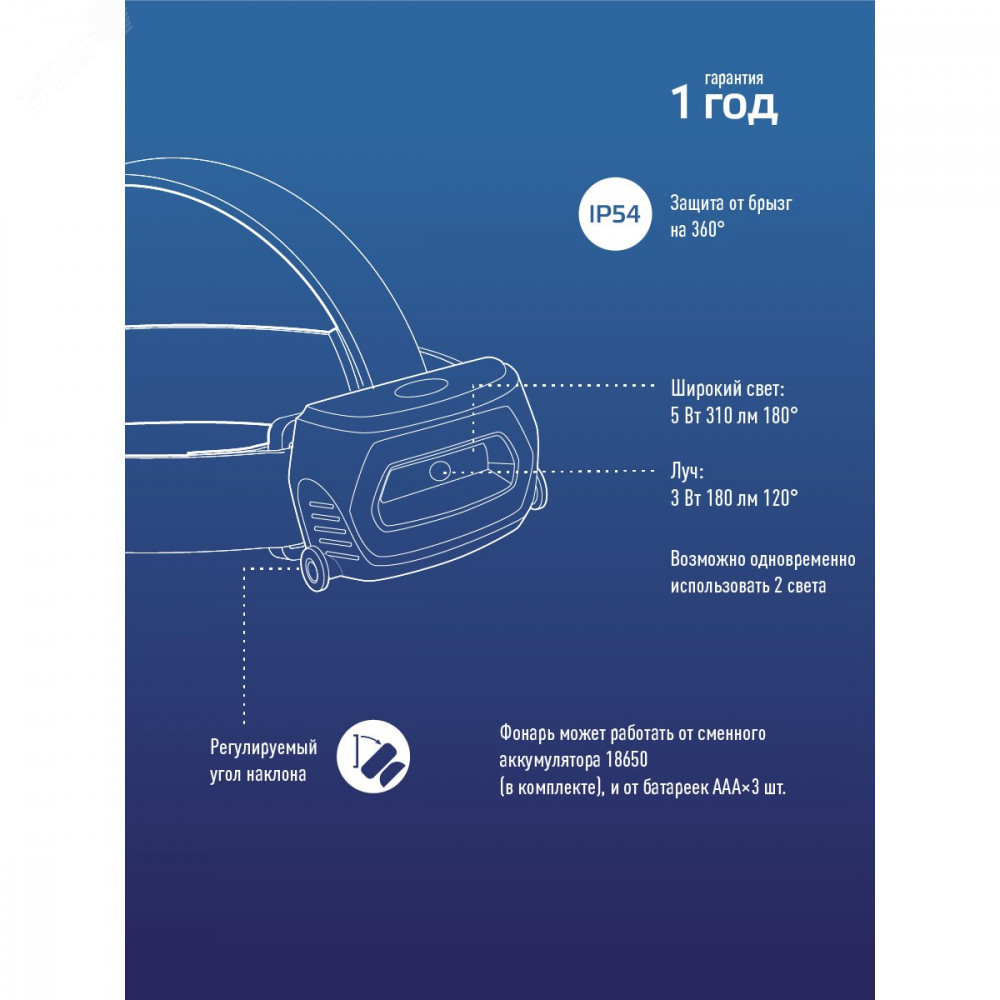 Описание Фонарь аккумуляторный налобный 3Вт XPE LED+5Вт COB LED с коллиматорной линзой съемный Li-ion 18650 1200мА.ч корпус ABS-пластик USB-шнур type C доп. держатель для батареек 3xААА регулируемый эласт. ремешок KOC509Lit