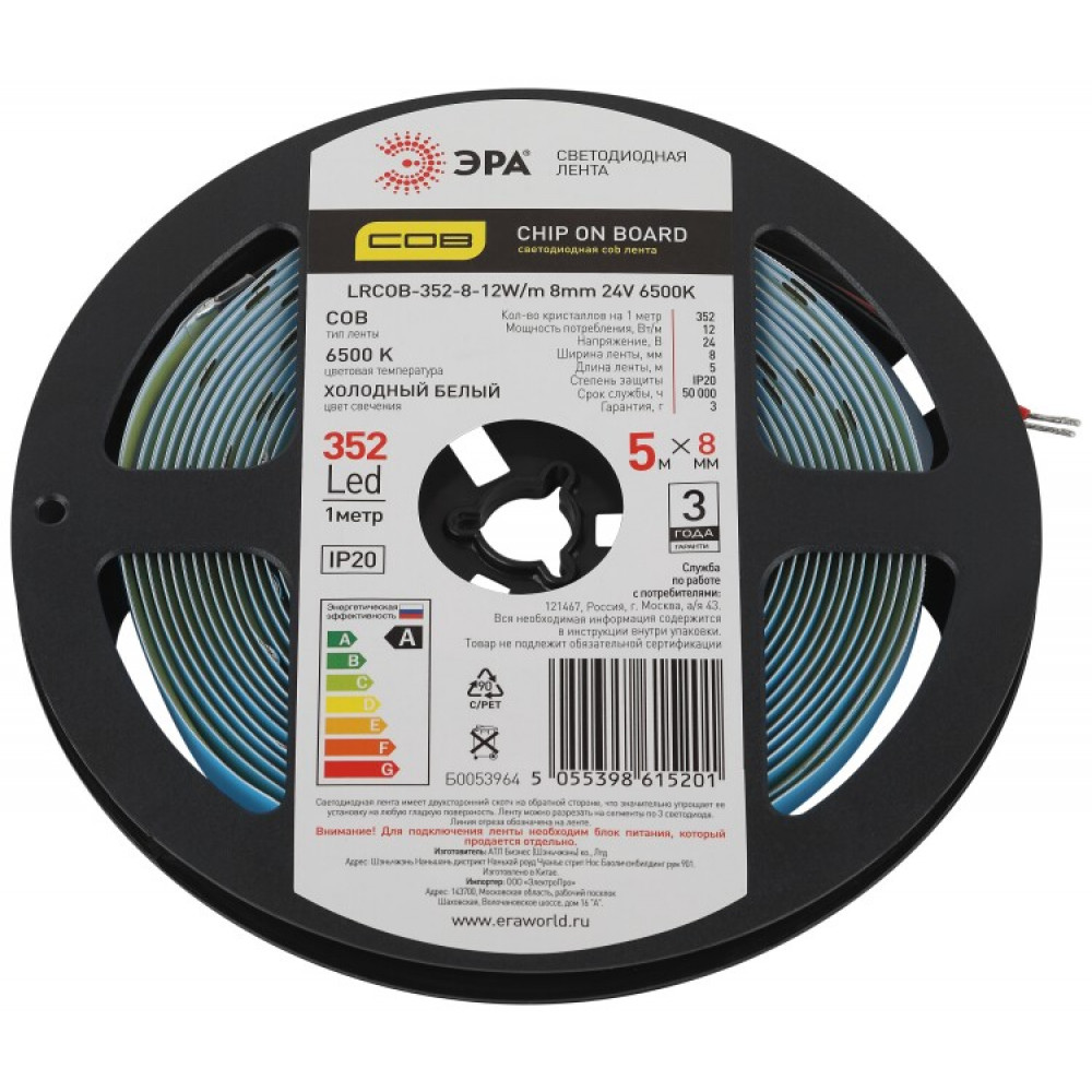 Лента светодиодная LRCOB-352-8 12W/m 8mm 24V 6500K 3year белая 5 м Б0053964, Лента светодиодная одноцветная белая