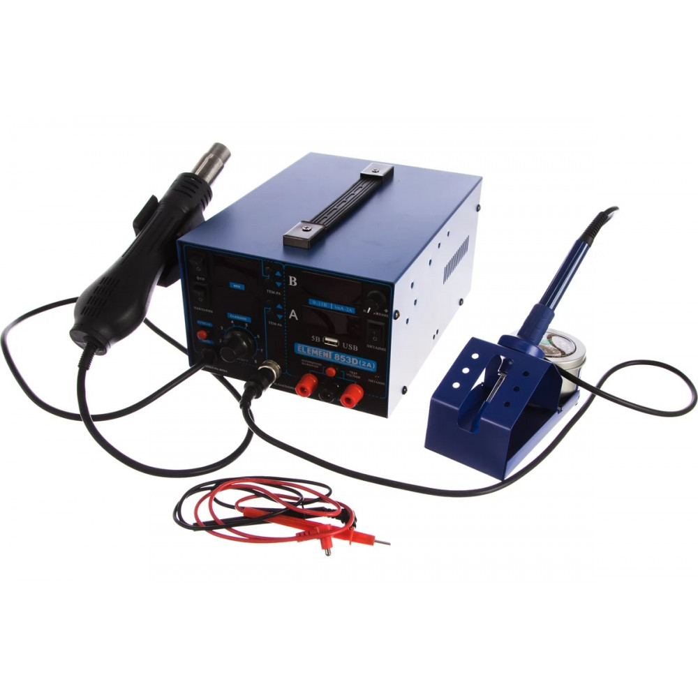 ELEMENT 853D, Паяльная станция 750Вт, фен 100-480°С, паяльник 200°-480°С, встроенный блок питания 0-15v/2А