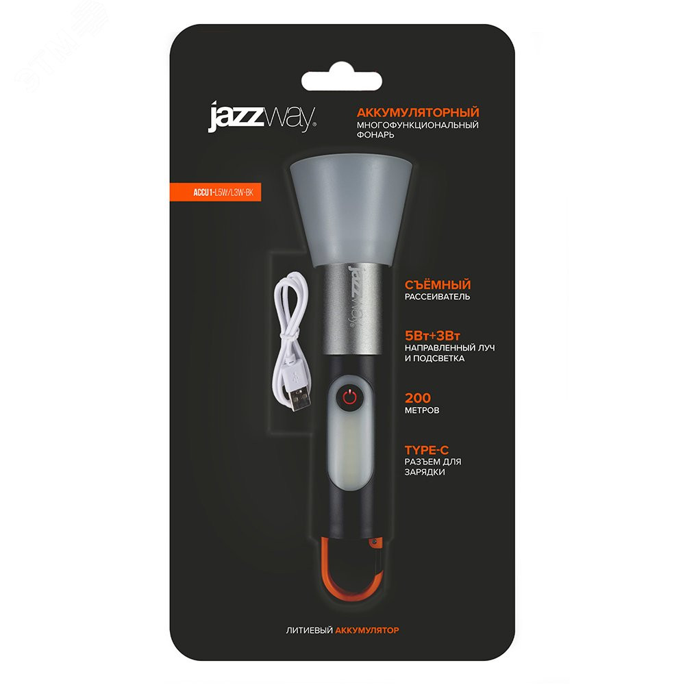 Описание Фонарь светодиодный ручной аккумуляторный Accu1-L5W/L3W-bk 5Вт+3Вт Li-ion 18650 1200мА.ч IP43 5048812