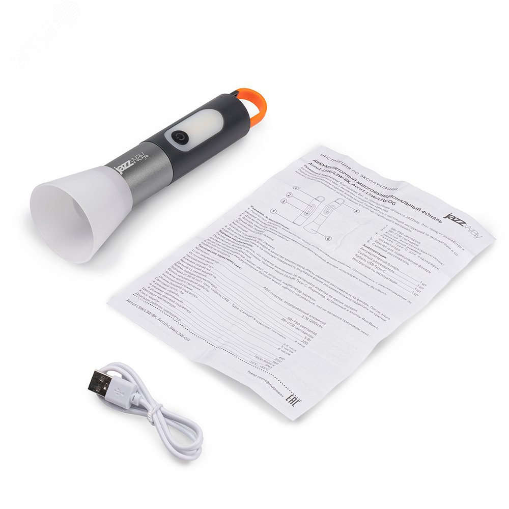 Фонарь оснащён встроенным литий-ионным аккумулятором 18650, 3.7 В. Емкость аккумулятора 1200 мАч. Зарядка от 5В 1А пост. тока, кабель USB – Type-C входит в комплект поставки.