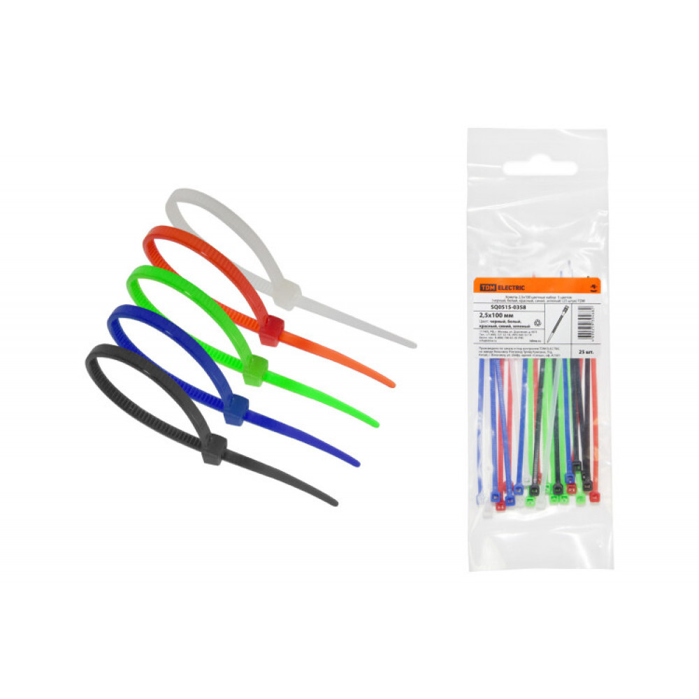 Описание Хомуты 2,5х100 цветные набор 5 цветов (черный, белый, красный, синий, зеленый) (25 штук) SQ0515-0358
