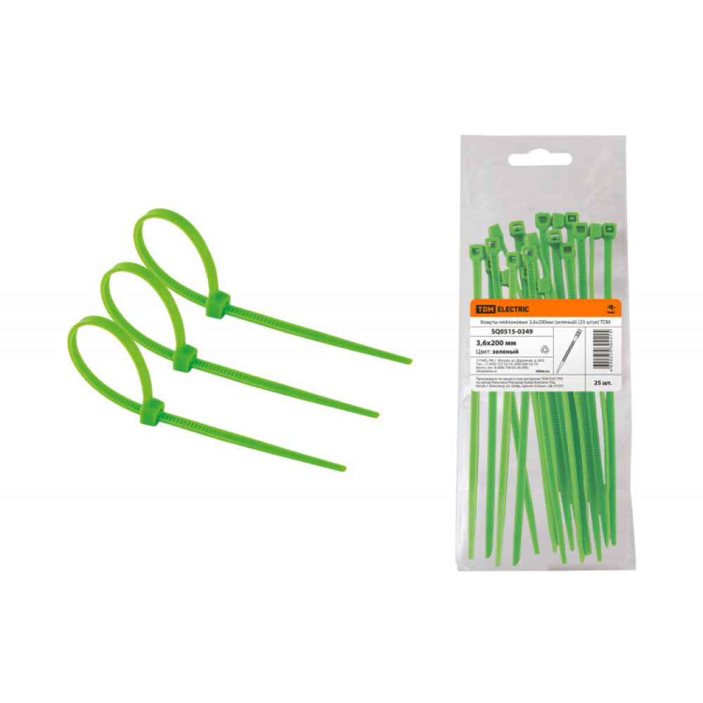 Описание Хомуты нейлоновые 3,6х200мм (зеленый) (25 штук) SQ0515-0349