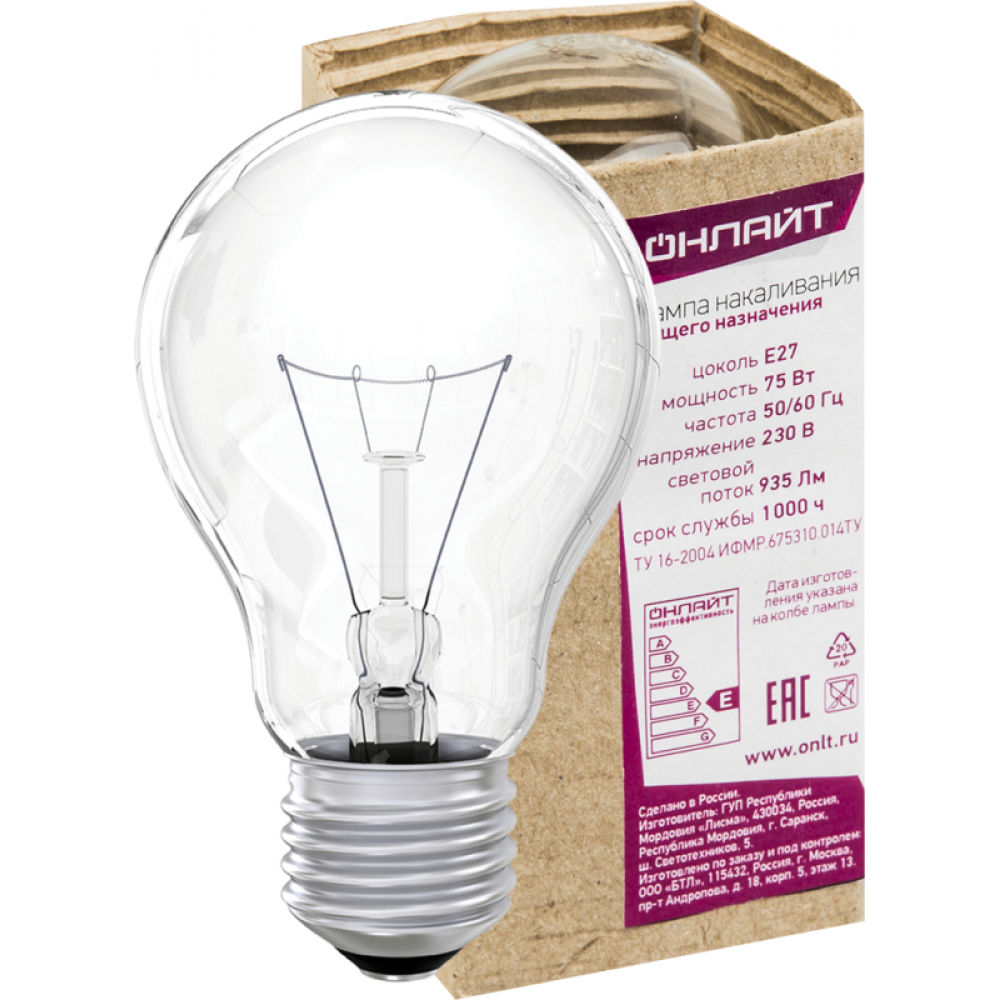 Описание Лампа накаливания 71 663 OI-A-75-230-E27-CL 75Вт E27 220-230В 71663