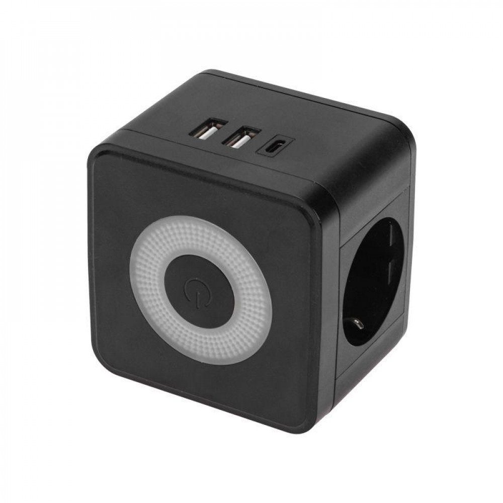 Двойник электрический Куб 16А с/з+2хUSB-A 2.4А+USB Type-C 3А с ночной подсветкой черн. 11-1252, Удлинитель, сетевой фильтр