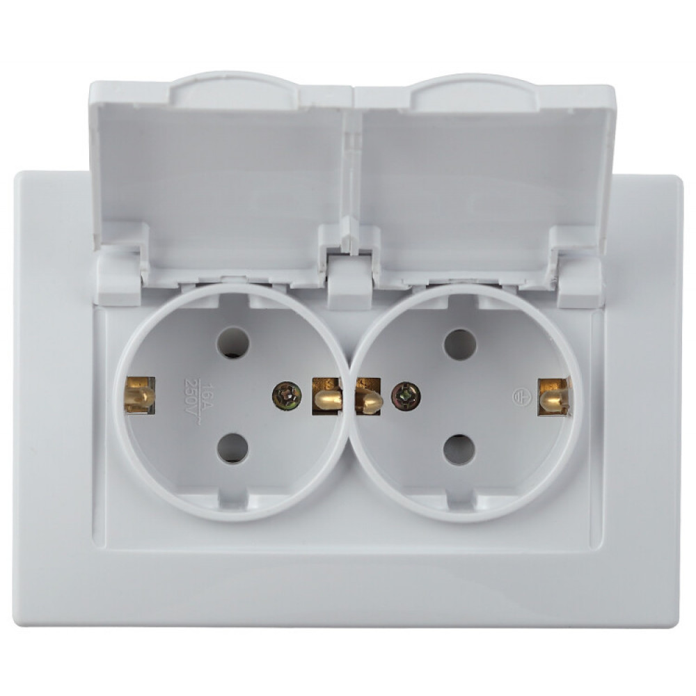 Розетка Plano 1-210-01 2х2P+E Schuko с крышкой шторками, 16А-250В, СУ, IP44, Plano, белый Б0048034, Розетка скрытого монтажа