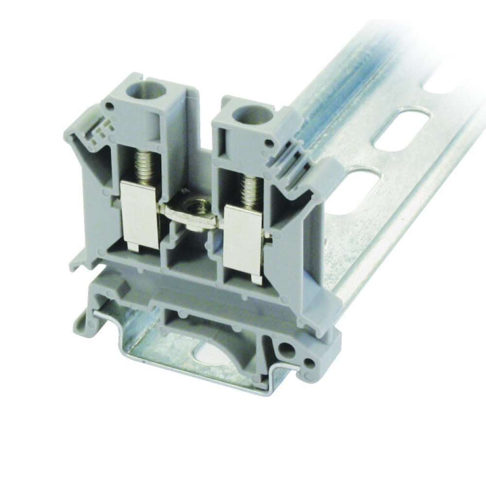 Проходная клемма, тип фиксации провода: винтовой, номинальное сечение: 4 мм кв., 32A, 800V, ширина: 6,2 мм, цвет: серый, тип монтажа: DIN35, винтовая перемычка, зажимная клетка: латунь