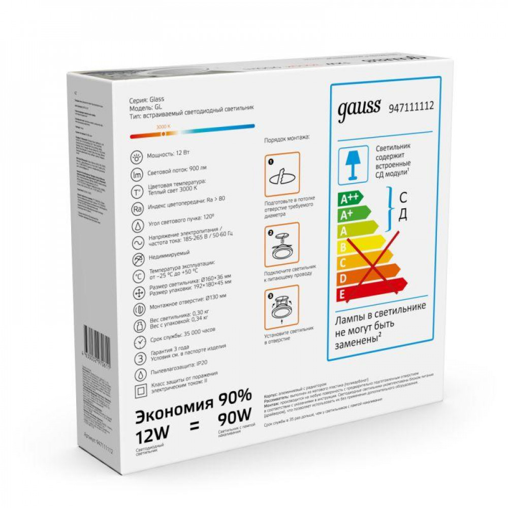 Описание Светильник круглый с декоративным стеклом,160х30, 118, 12W 3000K, 900лм 1/40 947111112