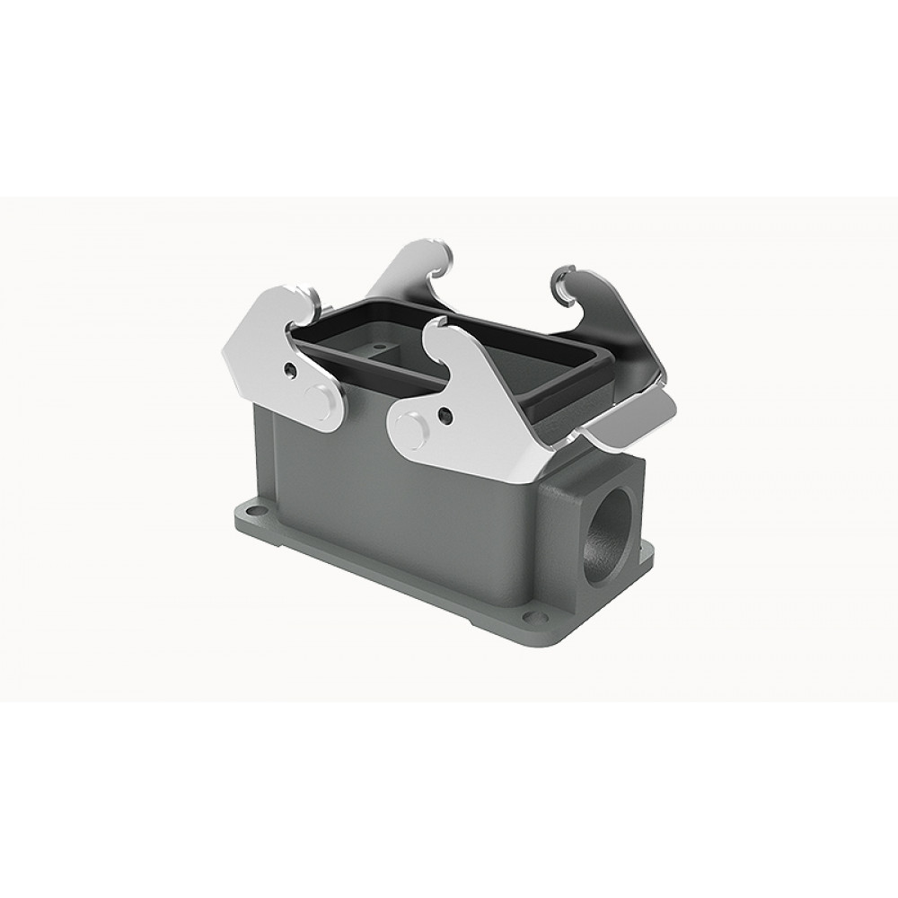 Основание разъема на панель, закрытое, типоразмер 10B, с уплотнителем, 2 отверстия с резьбой для кабельных вводов M20x1,5, с двумя защелками, без защитной крышки, материал корпуса: алюминиевый сплав