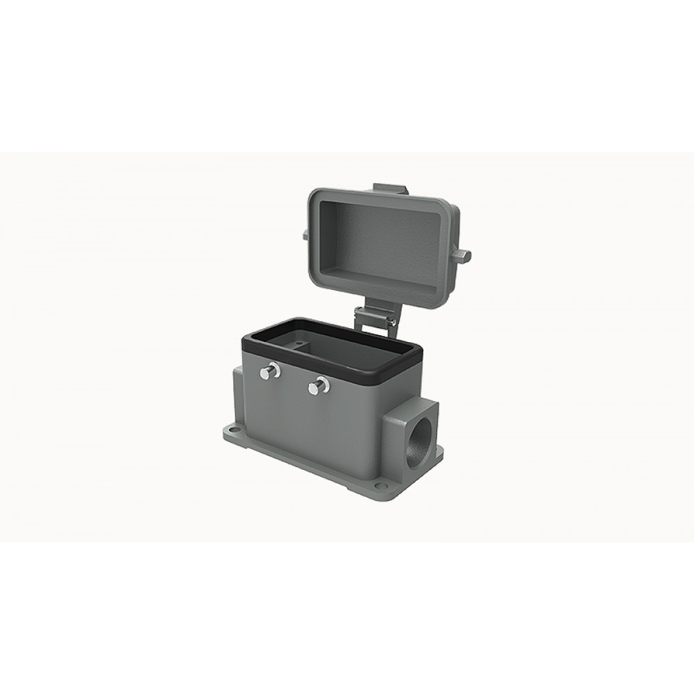 Основание разъема на панель, закрытое, типоразмер 10B, с уплотнителем, 2 отверстия с резьбой для кабельных вводов M20x1,5, без защелок (упоры для двух защелок), с защитной крышкой, материал корпуса: алюминиевый сплав