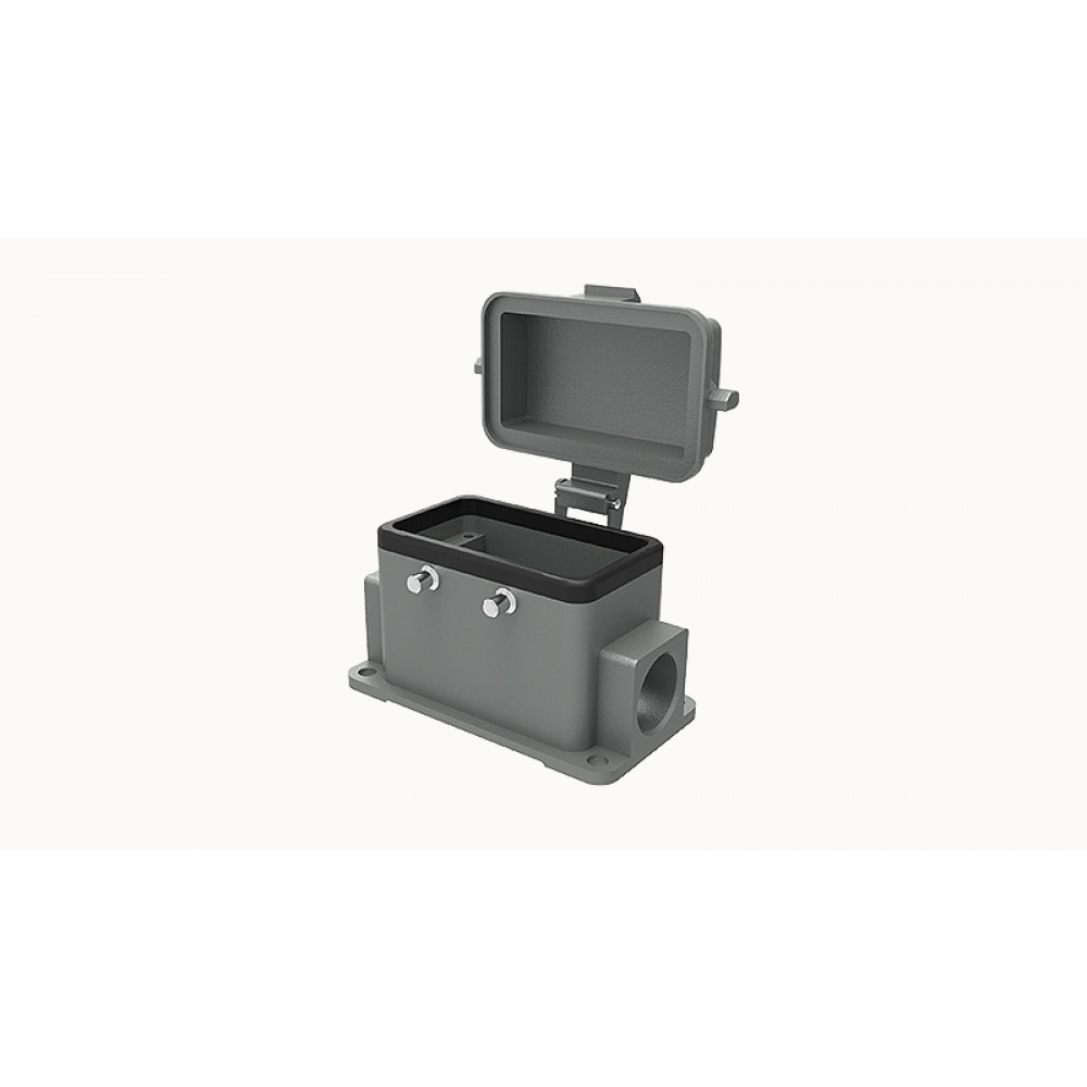 Основание разъема на панель, закрытое, типоразмер 10B, с уплотнителем, 2 отверстия с резьбой для кабельных вводов M25x1,5, без защелок (упоры для двух защелок), с защитной крышкой, материал корпуса: алюминиевый сплав