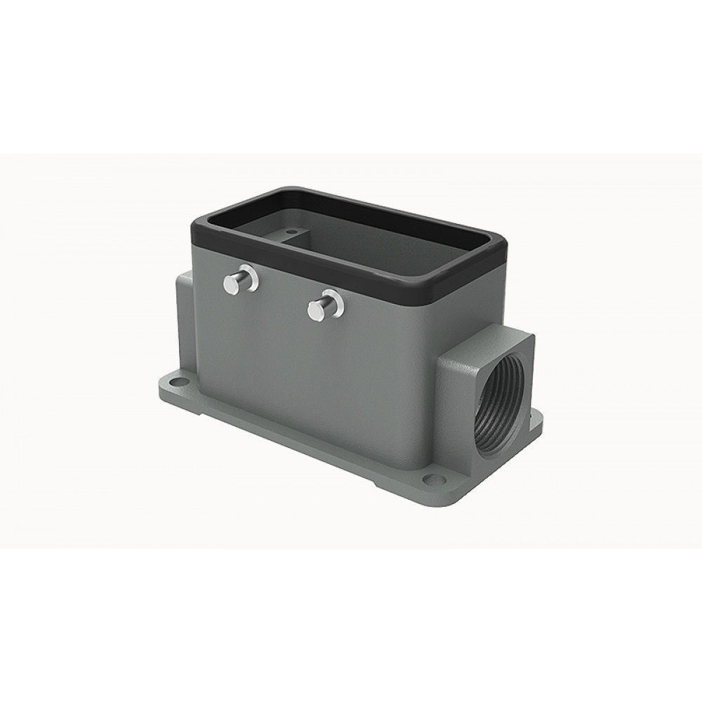 Основание разъема на панель, закрытое, типоразмер 10B, с уплотнителем, 2 отверстия с резьбой для кабельных вводов PG16, без защелок (упоры для двух защелок), без защитной крышки, материал корпуса: алюминиевый сплав